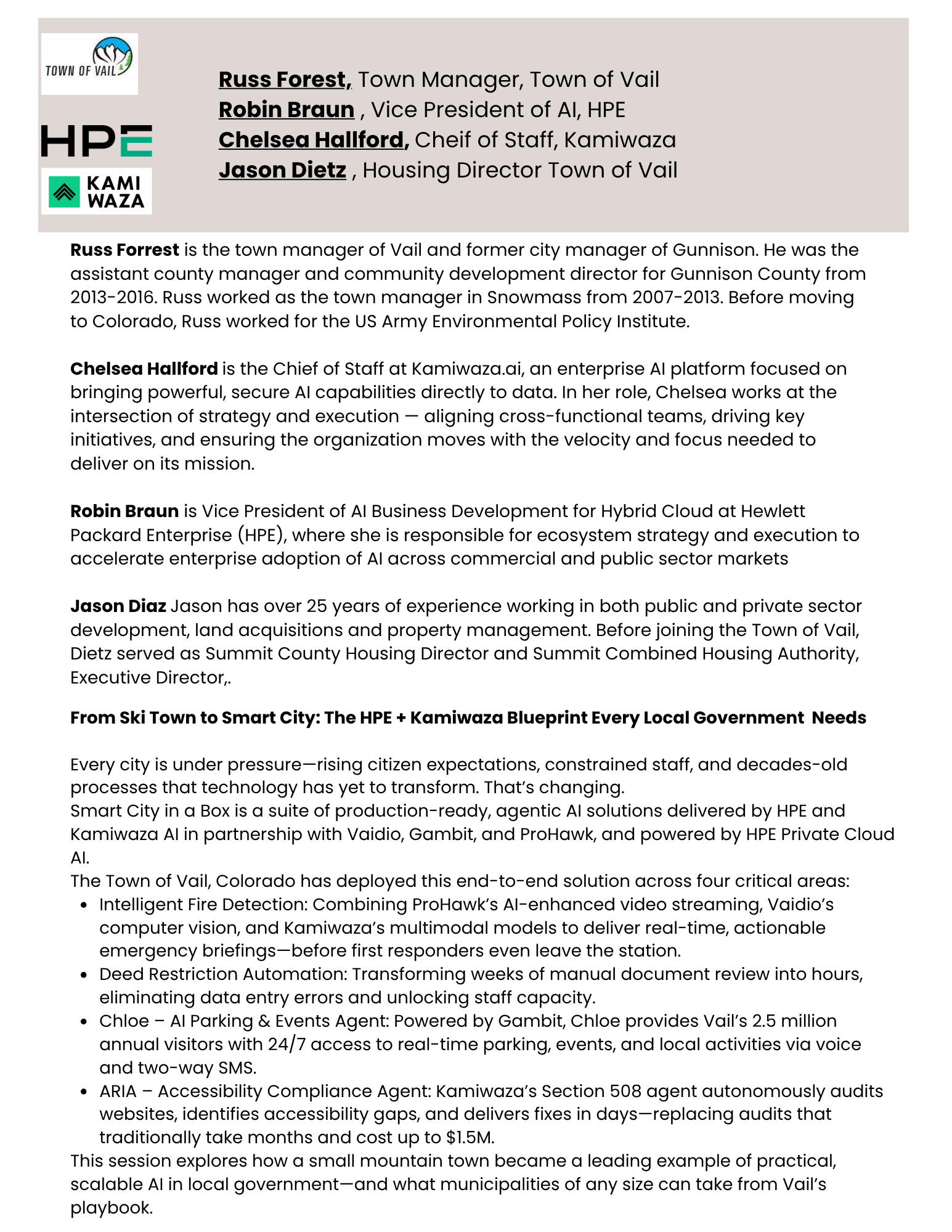 PRESENTER: Russ Forest, Town Manager, Town of Vail; Robin Braun, Vice President of AI, HPE; Chelsea Hallford, Cheif of Staff, Kamiwaza; and Jason Dietz , Housing Director, Town of Vail