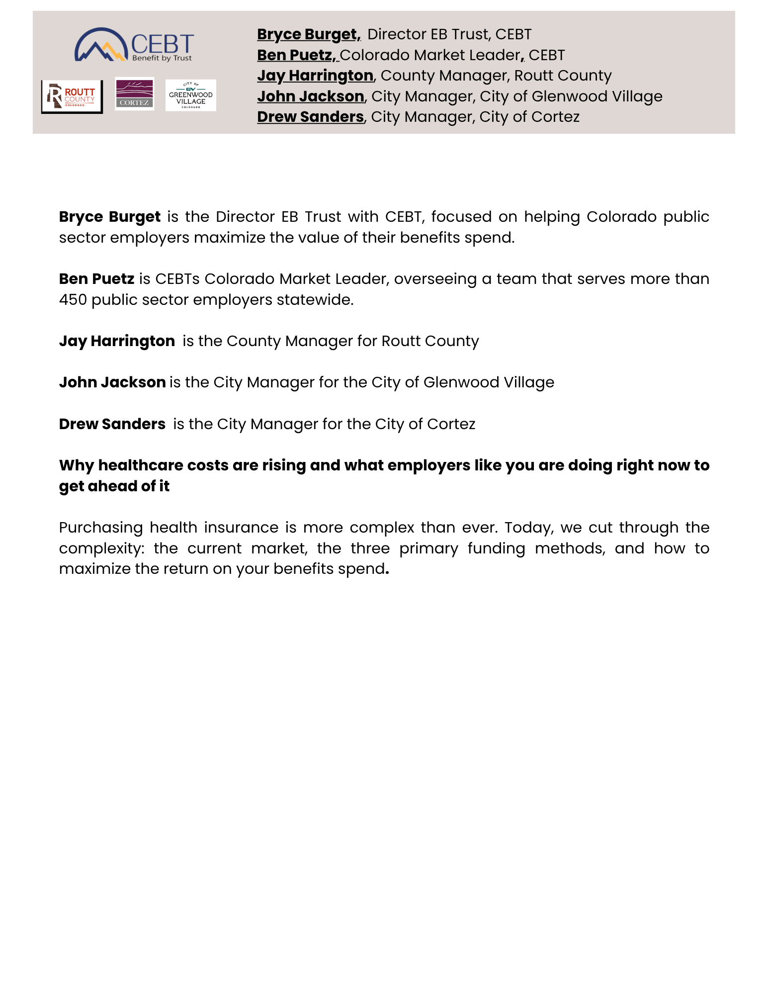 PRESENTERS: Bryce Burget, Director EB Trust, CEBT and Ben Puetz, Colorado Market Leader, CEBT