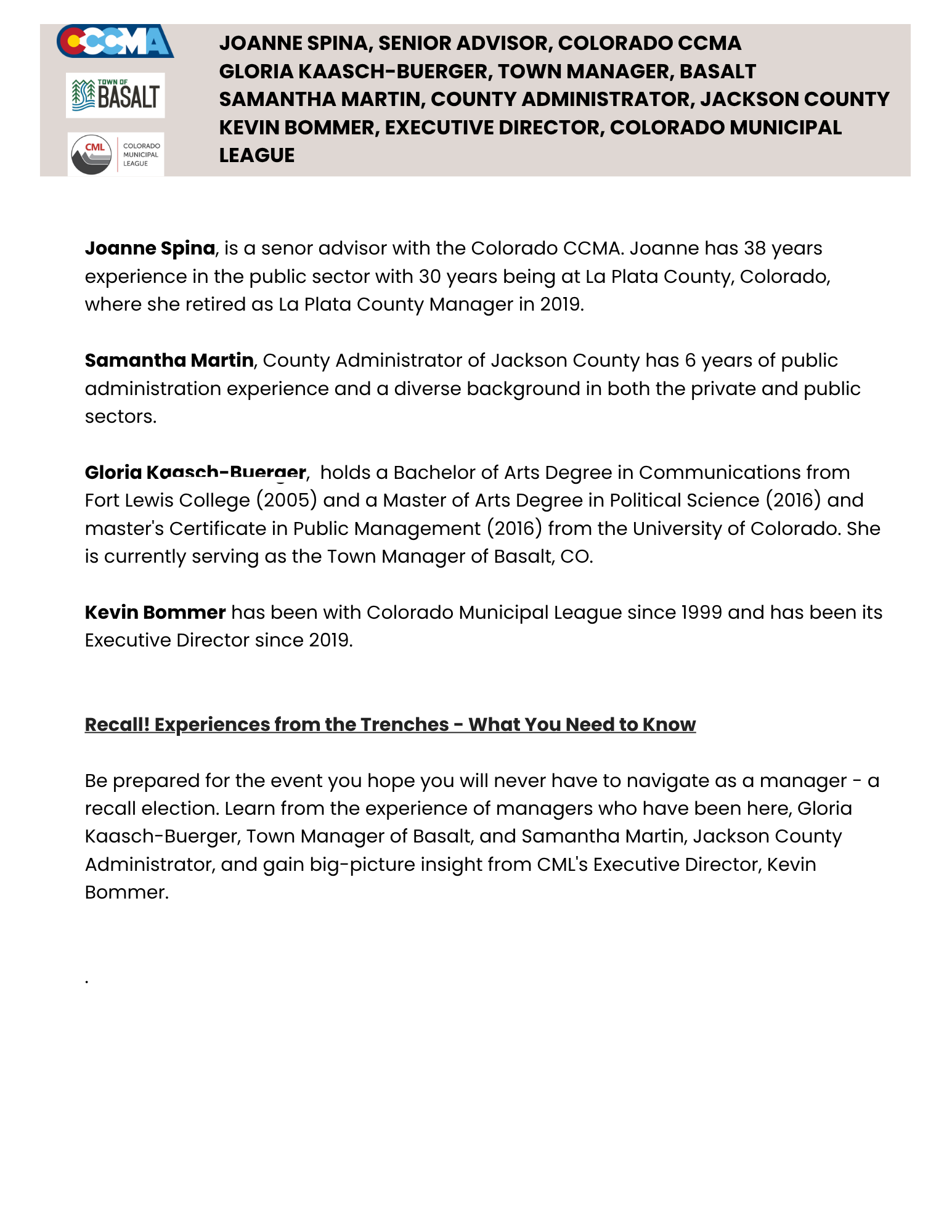 PANELISTS: Samantha Martin, County Administrator, Jackson County; Gloria Kaasch-Buerger, Town Manager, Basalt and Kevin Bommer, Executive Director, Colorado Municipal League